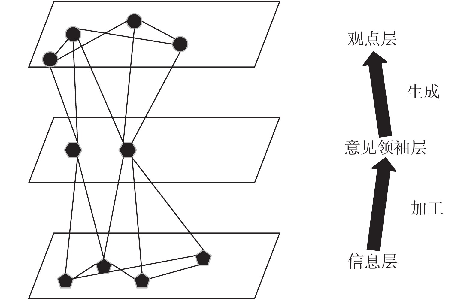 2 基于两级传播理论的超网络结构 2.1 三层超网络结构在真实的社交网络环境中,一般用户接触到的信息通常是多种多样的,仅对社交关系拓扑进行建模,或仅观测信息的流动都不足以整合复杂的多源信息。根据两级传播理论,信息流动的方向通常是由舆论领袖对原始信息进行再加工后再传播给一般受众[24],而且网民表达的观点也常常衍生于舆论领袖所发布的信息,有时更是直接引用舆论领袖发布的信息来代表自己的观点。由此我们认为真实的舆论场通常是:官方发布的当前舆论事件主要报道构成信息源;舆论领袖对这些信息进行加工和补充,使其变为大众可以理解和接受的内容;大众阅读意见领袖再加工的信息之后在社交平台表达自己的观点。这和二级传播理论也是相吻合的[25]。由此,舆论场的主要要素就由三部分构成,分别是原始信息、意见领袖传播、群众观点。将此三部分分别作为超网络层次即可构建本文所采用的超网络结构,其在舆论场中的作用机理如图1所示。