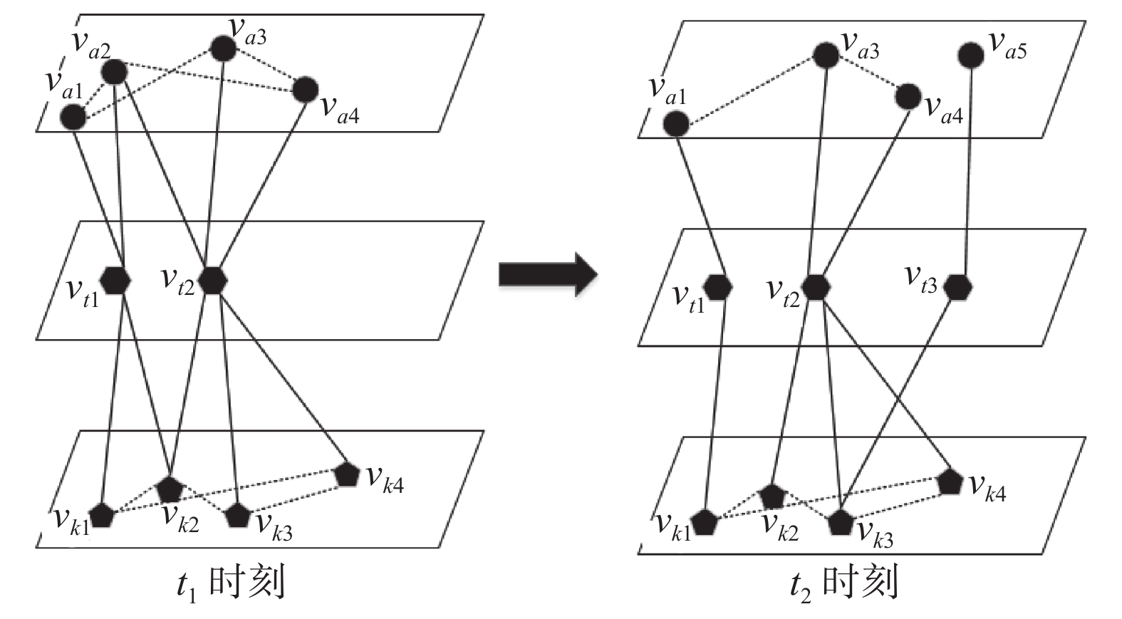超网络模型摒弃了复杂网络的单一层级结构,将社交网络中不同性质的信息化为异质节点存放于不同层的网络中,可以灵活地表示社交网络中的多样化信息。现有文献中对于超网络的应用主要有两方面:1)基于超网络的仿真模拟,2)利用各种度量指标在超网络上进行舆论建模度量分析[12-13]。仿真方向上主要讨论的是利用超网络结构结合动力学特征观察社交网络的演变及规律,如沈乾等[14]构造了线上线下两层超网络并定义了交互规则,讨论了线上线下的舆论传播区别;马宁等[15]设置了四层超网络,对舆论场的外驱动力和内驱动力进行了整体建模,并通过对实际案例抽象出的参数进行了超网络仿真,分析了事件不同阶段的特点;Wang等[16]给出了基于微信社交网络增长模式的超边增长和消亡仿真规则。基于超网络的度量分析主要是指对社交网络构造出的静态超网络的拓扑性质的研究,如利用超网络的结构度量指标来寻找潜在的意见领袖[17]或是采用适当的迭代算法发现社团结构[18-19];也有研究网络结构变化的预测问题,如Kapoor等[20]在研究点中心性过程中对超边赋权从而更好地预测超边变化对社交网络带来的影响以及Zhang等[21]提出社会学理论来预测链路的变化。