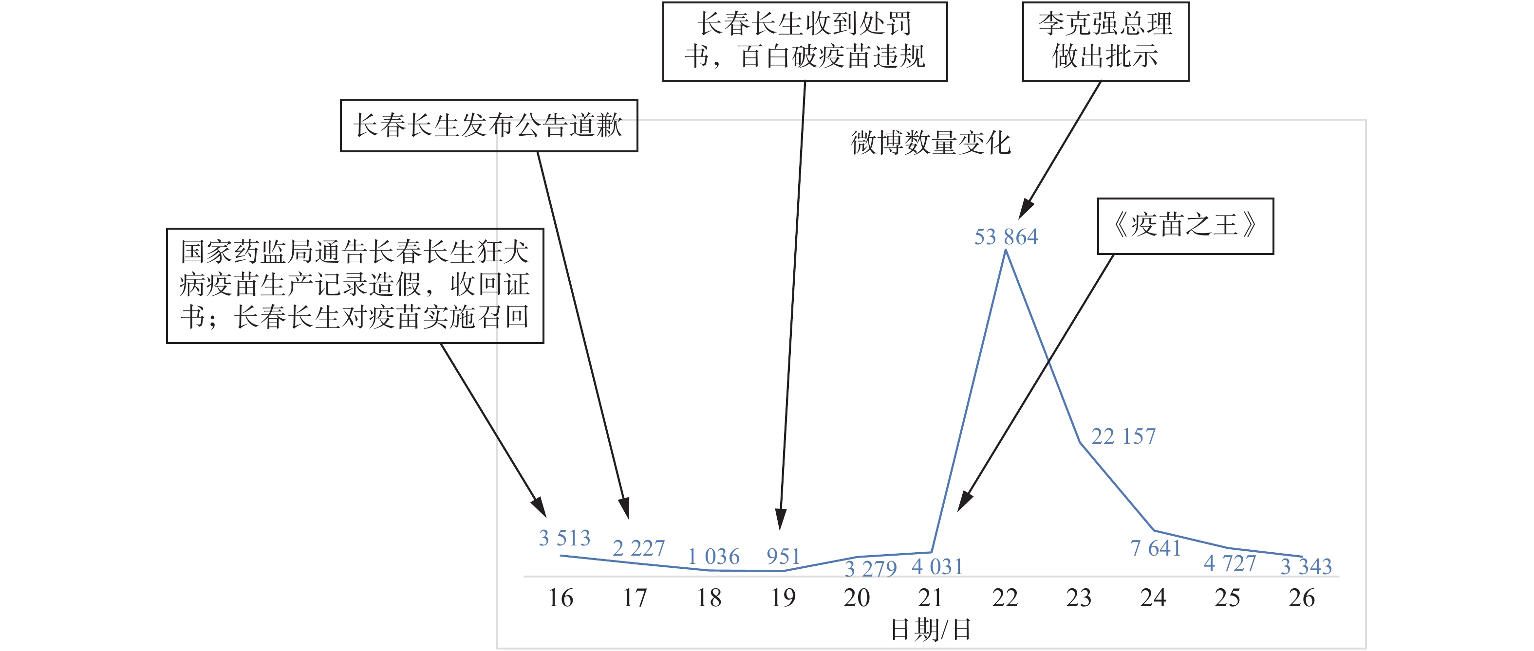 抓取数据每天的数量以及事后的新闻总结报道内容如图4所示。7月16日起药监局发出公告通告长春长生疫苗造假,至7月21日微博出现《疫苗之王》,可作为整场舆论事件的酝酿期;21日—23日可作为事件的爆发期。通过整理相关事件报导,发现不断发布新信息的时间段和微博相关发帖量的爆发阶段并不完全吻合。