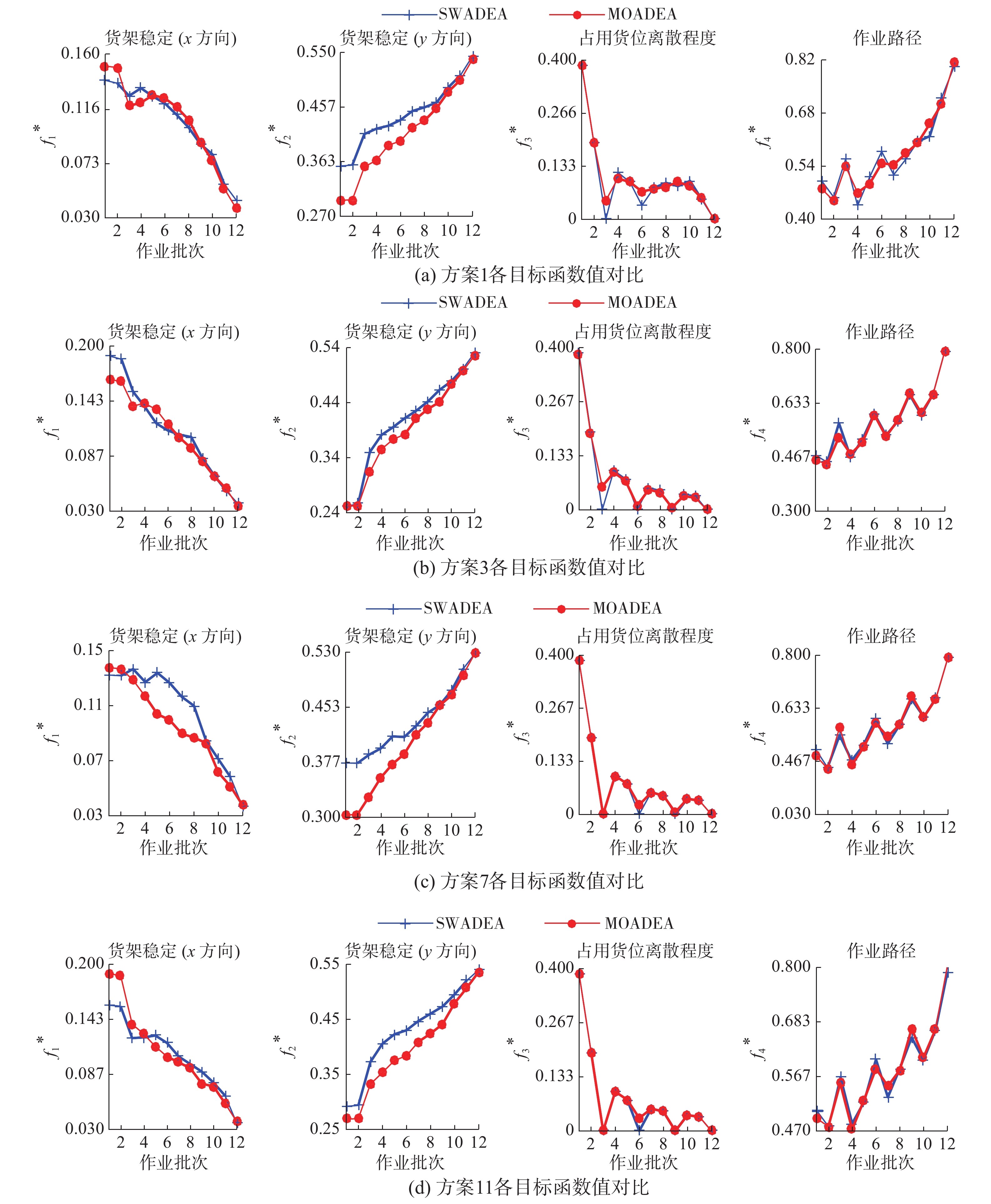 为了进一步分析影响货位持续优化能力的因素,并更好地观察SWADEA与MOADEA优化结果的差异,选择持续优化能力较好的4组权重方案(方案1、3、7、11),分析SWADEA与MOADEA各子目标函数值。如图5所示,随着作业批次的增加,x方向重心偏离货架中心程度