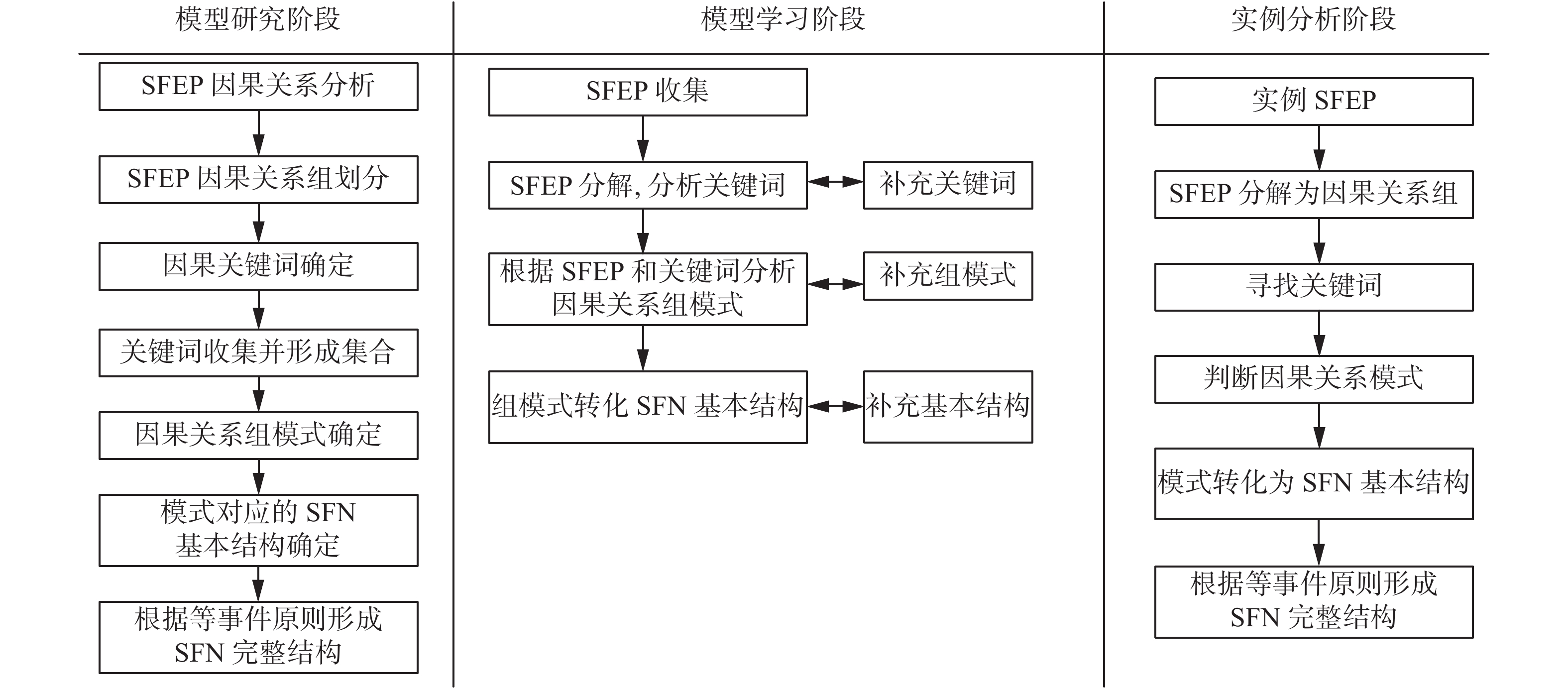 使用知识提取方法,将SFEP的描述文本转化为SFN基本结构可分为3个阶段,如图2所示,包括模型研究、模型学习和实例分析。