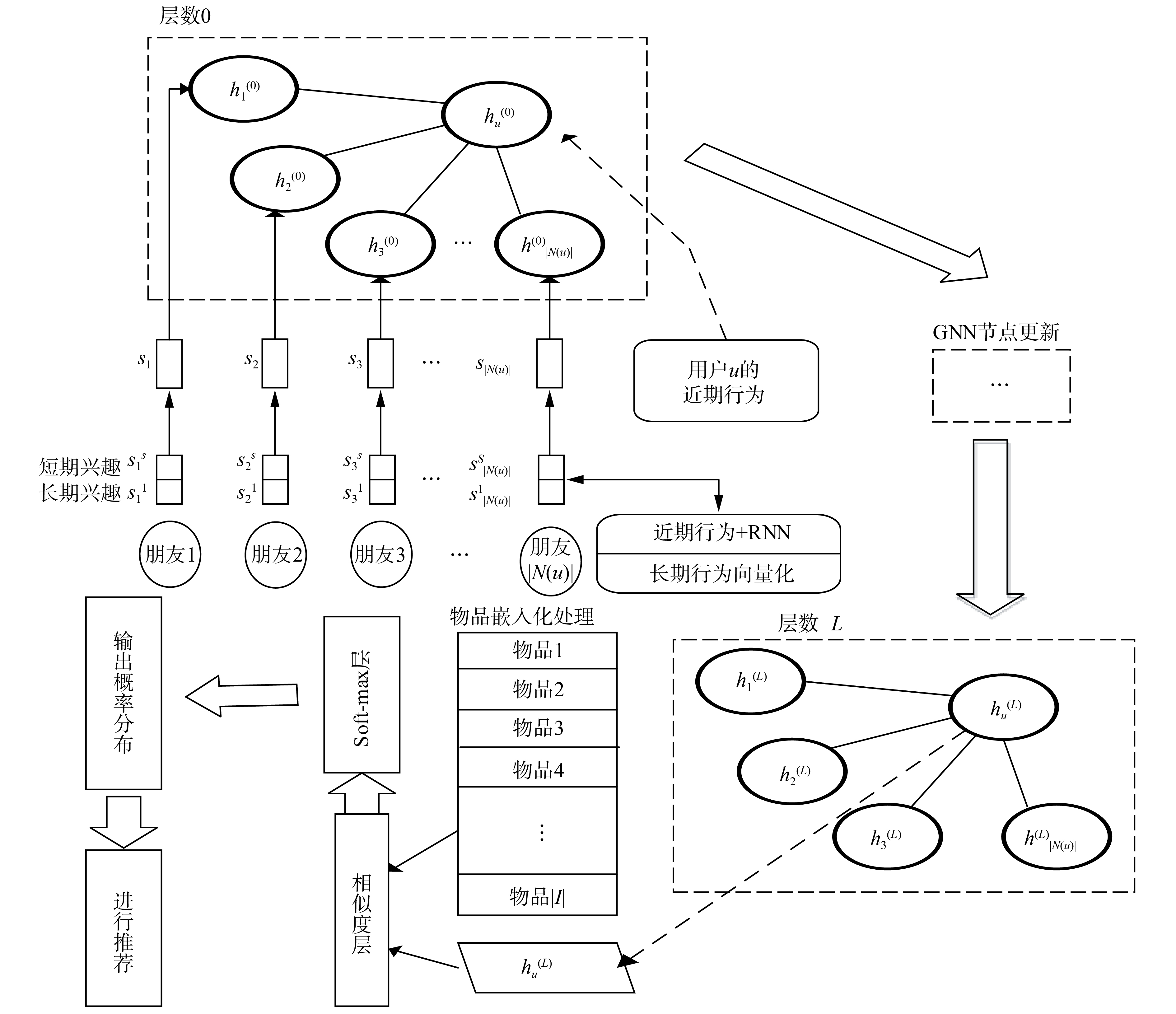 文献[30]中,考虑到用户的行为往往受到自己当前兴趣、朋友兴趣等多种因素影响,通过构建用户—朋友的无向单元图GNN,分别对用户节点、朋友节点进行描述,并使用相关传播算法更新用户信息节点,最后和物品嵌入化得到的结果进行运算,输出用户对物品可能的喜爱程度,如图1所示。具体步骤如下: