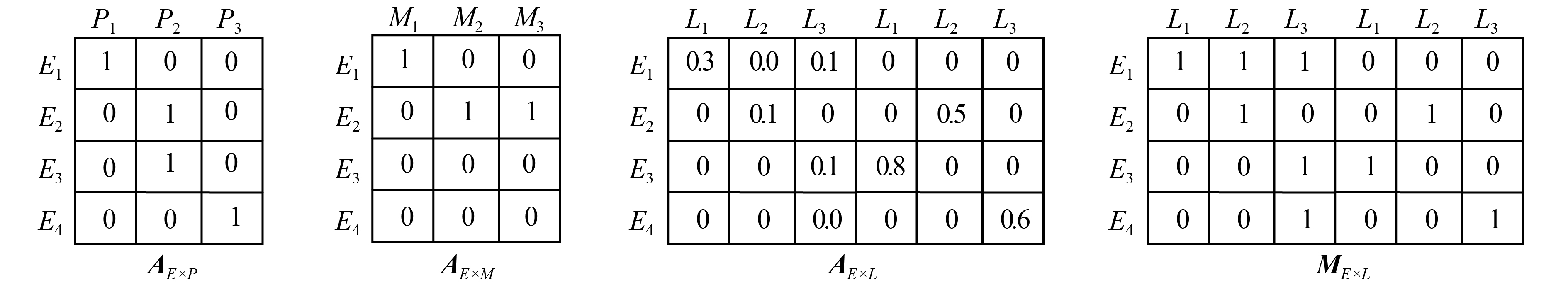 该研究中,节点之间的关系通过3个邻接矩阵进行表示,如图4,分别是AE×P、AE×M、AE×L,其中E为医疗科室,P为患者,M为药方,L为医疗测试结果;AE×P表示医疗科室与病人之间的关系,如果病人在该医疗科室进行过就诊,则为1,否则为0。假设一个病人可以对应多个医疗科室,但是一个医疗科室只能对应一个病人,也就是说,一行最多只有一个1。AE×M表示医疗科室与药方之间的关系,如果该科室可以开出对应的药方,则该值为1,反之为0。AE×L表示医疗科室和医疗测试结果之间的关系,如果某个医疗科室有该实验测试则该两点之间有权重,选择的值是平时测试的平均值,为了对一些测试结果是0的项目进行区别,作者额外增加了一个ME×L矩阵,对于存在的项目则对应数字为1,否则为0。最后一个矩阵表示医疗科室和药方之间的关系,如果该医疗科室有对应的药方则该点为1,否则为0。