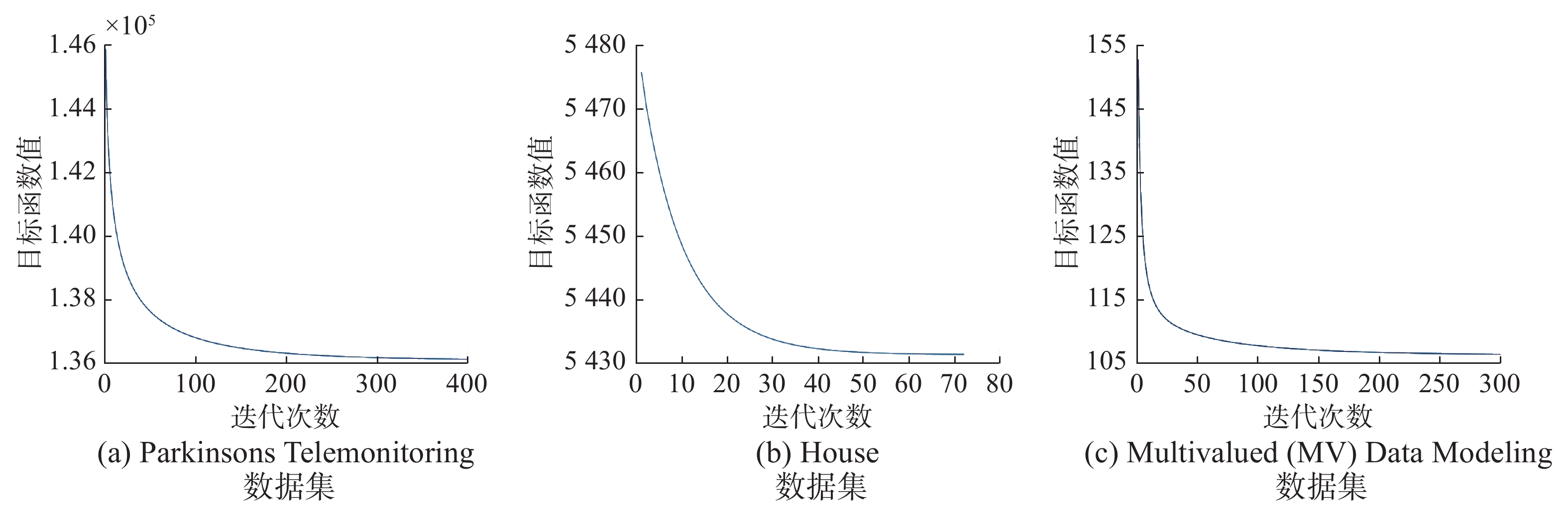为了进一步研究本文提出的MTTSKFS-CS建模方法的收敛性,我们选取了Multivalued (MV) Data Modeling、Parkinsons Telemonitoring和House 3个数据集,通过交叉验证寻优得到最优参数,并在最优参数的基础上进行收敛性实验。算法在3个数据集上的收敛曲线如图3所示。从收敛曲线中可以看到,算法在前期可以快速收敛,并迅速进入稳定状态。实验结果说明,本文第3节提出的优化方法具有良好的收敛性能,能够真正达到模型最优化的目的,从而使模型获得较高的实用性。