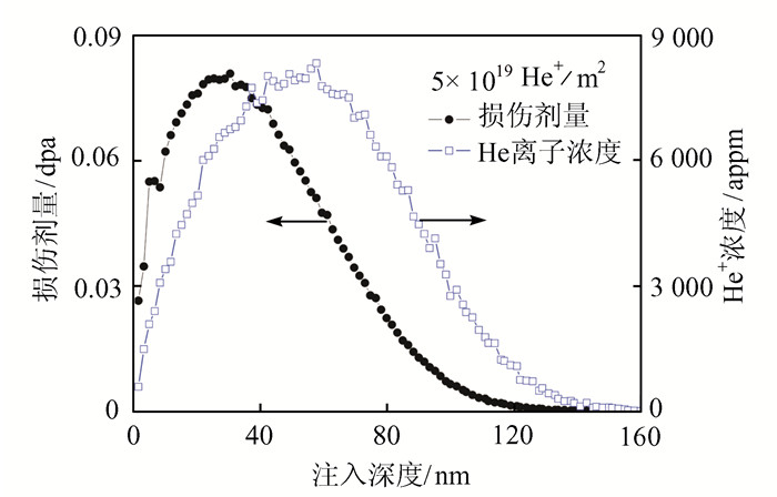 | 图 1 SRIM计算所得钨在20 keV He+辐照下损伤剂量和He+浓度的分布图 Figure 1 The damage dose and He+ concentration range distribution in tungsten under 20 keV He+ irradiation by SRIM calculation |