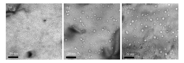 | 图 3 钨在800 ℃ He+辐照下的氦泡分布,剂量分别为: (a) 5×1019 He+/m2; (b) 1×1020 He+/m2; (c) 5×1020 He+/m2 Figure 3 He bubbles in W under He+ irradiation with fluences of: (a) 5×1019 He+/m2; (b) 1×1020 He+/m2; (c) 5×1020 He+/m2 |