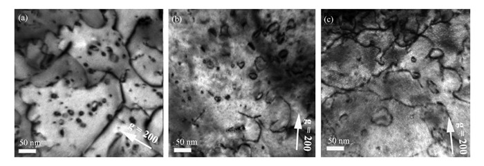 | 图 4 钨在800 ℃ He+辐照下的位错环分布,剂量分别为: (a) 5×1019 He+/m2; (b) 1×1020 He+/m2; (c) 5×1020 He+/m2 Figure 4 Dislocation loops in W under He+ irradiation with fluence of: (a) 5×1019 He+/m2; (b) 1×1020 He+/m2; (c) 5×1020 He+/m2 |