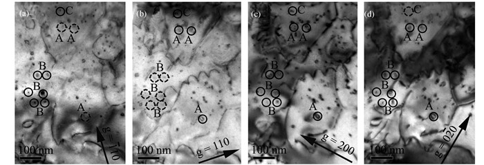 一般情况下,当g·b ≠ 0时,位错环会出现,而当g·b=0时,位错环会消失,可称之为g·b=0不可见准则.通过不可见准则,可以判断位错环的柏氏矢量.图 5是钨在[001]带轴下4个不同的g条件下获得的位错环图片(g=110,110,200和020).钨是体心结构材料,只有b=〈100〉和1/2〈111〉两种类型的位错环,因此可以列出表进行比较,如表 1所示.表 1给出了[001]带轴下所有可能|g·b|的值.因此通过对比图 5和表 1确定本实验中5×1019 He+/m2辐照下钨的位错环的柏氏矢量.为了便于判定位错环类型,在图 5中对位错环用圆圈及字母A,B,C进行标记.实线圆圈表示位错环出现(也即g·b≠0),而虚线圆圈表示位错环消失(即g·b=0).例如,A类位错环只在g=110的条件下消失(图 5(a)),在g=110,200和020的条件下都出现(图 5(b),5(c)和5(d)),即在g=110的条件下g·b=0,从表 1中可以确定出这种位错环的柏氏矢量为b=±1/2[111]或±1/2[111].同理,B、C类位错环的柏氏矢量可以确定分别为b=±1/2[111]或±1/2[111]和b=±[100].因此可以在800 ℃辐照后的钨中发现1/2〈111〉和〈100〉两种类型的位错环.并且通过图 5,可以发现A和B类型位错环居多,而C类型位错环偏少,因而大部分位错环是1/2〈111〉类型.