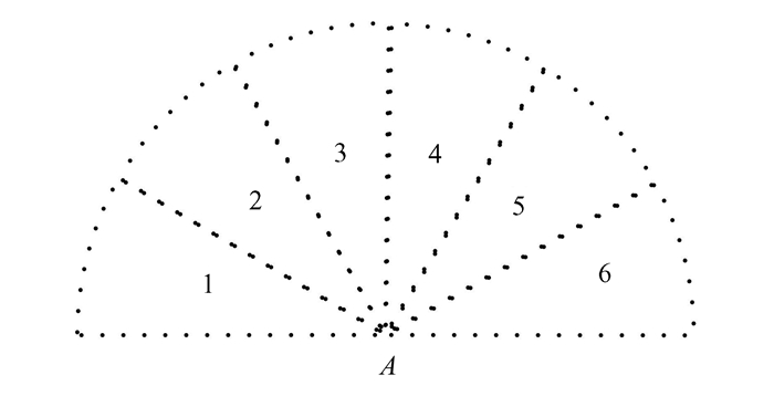 2 海风信息提取方法 2.1 风向的提取S波段多普勒雷达提取风向方法与天线阵列分布有关,如图 1所示,雷达放置在A点,由6根标准的喇叭天线组成,均为垂直极化,每根天线的3 dB主瓣宽度约为30°[7],6根天线按照半圆形排列,通过时分复用方式扫描整个半圆形海面,获取180 °回波后,通过6个方位数据进行线性插值,生成关于角度与频率的二维海浪谱,然后对频率域进行积分,得到仅关于角度的海浪谱Sph,最后用谱矩法计算风向,即用海浪角度谱的一阶矩除以零阶矩[8]: