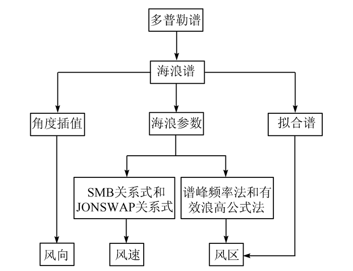 2.4 风信息提取流程S波段多普勒雷达海风信息提取方法的主要步骤如下:先通过雷达回波的多普勒频移得到连续时间的水质点径向速度序列,对速度序列进行傅里叶变换得到速度功率谱,根据转换函数获取各天线的海浪谱.然后通过角度插值获取关于角度的二维有向海浪谱,并得到风向;利用海浪谱得到相关的海浪参数,代入(2)式和(3)式即可得到风速;通过谱拟合法、谱峰频率法和有效浪高公式法获取风区.风信息提取流程如图 2所示.