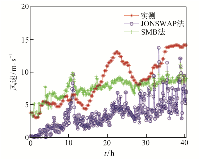 提取风速结果如图 4所示,雷达每3 min产生一个风速数据,风速风向仪0.5 h产生一个实测风速数据,时间约40 h.从图 4可以看出两种方法整体趋势与实测风速相近,但JONSWAP整体风速偏小.第16~28时提取的风速与实测风速相差较大,这可能与此时风速处于快速上升时期有关.海浪此时处于未饱和状态,导致海浪参数会产生一定误差,说明风速快速变化会对反演风速的效果产生影响,而且在实测风速值较高的时间点,同样会出现反演风速误差较大的情况.