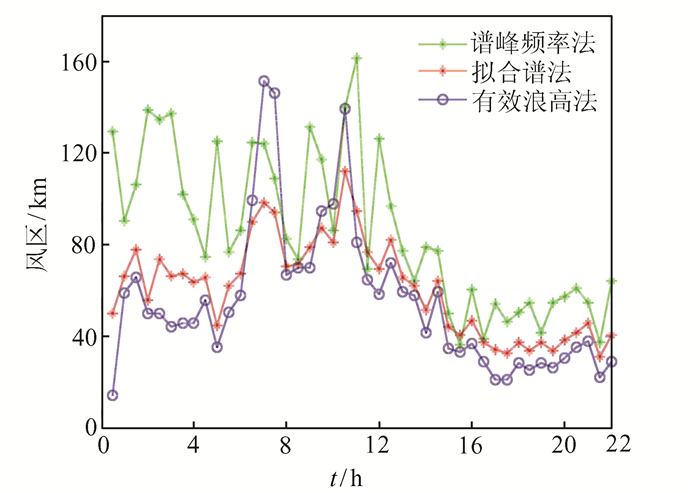 2.3.4 风区提取方法比较理论上讲,谱峰频率法和有效浪高法都属于经验公式计算法,有一定的理论依据和普遍适用性,但本质上更依赖于海浪参数的精准性,所以提取风区效果可能略差.而拟合谱法是通过拟合实测海浪谱得到相应的参数,减少了从海浪谱得到海浪参数的过程,所以准确性更高.
