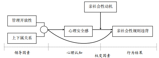 然而, 尽管员工遵循组织规范有利于组织的平稳运作,但是刻板地坚守所有的规范则可能会抑制员工主动性和创造性的发挥, 阻碍员工寻找创新性的问题解决方法[4, 5]. 而且由于组织内外部环境的变化, 一些规范本身也会因"不合时宜"而需要变革和发展, 此时固守这些规范反而会损及组织的利益或福祉. 因此在现实中, 员工在有些情境下也会出于亲社会性 (pro-social) 或非自利性意图而展现出违背规范的偏差行为, 但这类偏差行为在很长一段时间里却处于相对被忽视的地位. 直至2003年, 在积极组织学 (positive organizational scholarship) 和积极组织行为学 (positive organizational behavior) 运动的影响下, 才有研究者开始较为深入地探讨建设性偏差 (constructive deviance) [4, 6]和积极偏差 (positive deviance) [7]的概念及相关问题, 其描述的即是一种为了提升组织或其利益相关者福祉而违背重要规范的自愿行为. Morrison则在此基础上进一步提出亲社会性规则违背 (pro-social rule breaking,以下简称为PSRB) 这一构念, 用以解释一种受帮助组织实现其目标的愿望所驱动的规则违背行为[8]. 例如,某药品零售企业的一位门店经理虽然知道规章不允许, 仍经常在回家途中为那些行动不太方便的老年顾客递送药品; 由于时间非常紧迫,某公司的一位行政专员自行复印了所需的文件材料, 而没有按照规定将之送到公司文印中心进行登记、复印[8]. 作为积极偏差的一种具体形式, PSRB反映了员工经常面临的这样一种现实选择困境: 一方面, 组织规则被认为与组织的目标是一致的,因而需要遵循; 另一方面, 在某些情境下违反规则事实上对组织有益并能够提升组织的有效性.