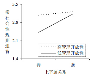 由图 2可以看出: 当管理开放性较高时, 上下属关系与员工PSRB之间的正向关联性较弱; 当管理开放性较低时,上下属关系与员工PSRB之间的正向关联性较强. 反之亦然,因此假设3获得证实.