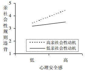 亲社会性动机是指个体的一种付出努力以帮助或造福他人/群体的愿望[36, 37]. 在组织中,员工的亲社会性动机可以指向不同的受惠者, 如同事、上司、集体 (组织或部门) 以及顾客等[37]. 研究表明, 在工作情境下, 员工的亲社会性动机与较高水平的工作绩效、个人主动性和组织公民行为存在正向关联性[38], 并能强化内在动机与创造力、核心自我评价与绩效等变量之间的关系[39, 40]. 如前文所述,本研究认为心理安全感较高的员工更有可能会做出PSRB行为. 我们进一步推测这种感知与最终的行为之间还存在不确定性, 会受到一些个体或情境因素的影响,亲社会性动机即是其中之一. 心理安全感只是为PSRB提供了必要的前提条件, 而亲社会性动机的高低则会在一定程度上决定此种条件与实际行为之间关联性的强弱. 当个体的亲社会性动机较高时, 较强的心理安全体验加上帮助他人或集体的愿望, 将会促使这类个体做出较多的PSRB行为; 而当个体的亲社会性动机较低时, 对组织或其利益相关者福祉的较低关注度使得他们缺乏做出PSRB的意愿, 因此即使心理安全体验较强,他们也应较少会表现出PSRB行为.