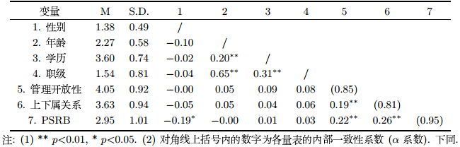 为了考察本研究中各研究变量(管理开放性、上下属关系和PSRB) 的区分效度和建构效度,研究者针对它们进行了验证性因素分析 (CFA). CFA结果显示,三因素模型的拟合度是较为理想的 ($\chi$$^{2}$/df=1.92, CFI=0.95,TLI=0.94,RMSEA=0.07), 且所有项目载荷的t检验结果均达到了显著性水平 ($p < 0.01$), 说明在同一因素下的测量项目能反映出相同的构念. 而单因素竞争模型的分析结果表明其各项拟合指标均不理想 ($\chi$$^{2}$/df=7.17,CFI=0.62,TLI=0.57,RMSEA=0.18). 以上比较结果证实本研究中的三因素模型是可以接受的. 2.3.2 相关分析结果