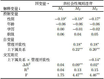 如前文述及的, 尽管现有的相关研究已从个体特征和工作特征等方面对员工PSRB的影响因素进行了实证分析, 但迄今尚无研究者就领导相关因素与员工PSRB之间的关系做理论阐述或实证检验. 本研究针对此一问题从管理开放性和上下属关系两个方面所进行的初步探索, 对当前员工PSRB研究领域而言应是一个非常有益的补充和拓展, 表明了与规则执行者相关的因素对于员工PSRB的重要意义, 并应会启发未来研究在这方面做更广泛的探讨. 这是本研究的第一个理论贡献.