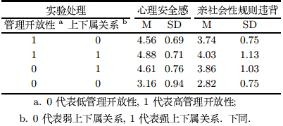 此外,就本研究的情境实验研究而言,亦存在需要进一步完善之处: (1)在实验情境的理解方面,本研究中被试在阅读相关情境时, 对情境故事描述中所隐含的管理开放性和上下属关系的操纵, 必然会形成他们自己的理解和诠释. 然而被试所理解的强度与内涵是否会因个人经历与价值取向的不同而存在个体间的差异, 仍有待于未来研究通过质性访谈等方式来加以澄清. (2) 在中介机制的检验方面,本研究发现除了通过心理安全感这一中介因素外, 上下属关系对员工PSRB还具有直接效应, 这说明在本研究确认的中介路径之外, 上下属关系还会通过其他的方式来促进员工PSRB. 这也值得今后研究的进一步探索.