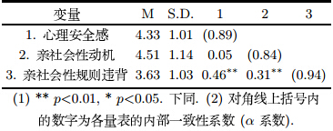 PSRB:采用Dahling等[9]所开发的PSRB量表. 原量表含有"改进效率"、"帮助同事"和"改善顾客服务"三个分量表, 不过由于第三个分量表并不具备跨岗位的普适性 (例如企业中生产或财务部门的员工一般并不会直接面对顾客), 因此本研究只采用了前两个分量表. 代表性项目如: "为了给公司节省时间和开支,我违背了组织的政策 (改进效率)"; "为了帮助同事履行其职责,我违背了组织的规则 (帮助同事)". 在本研究中,它们的内部一致性系数分别为0.94和0.92.