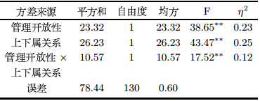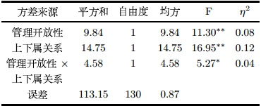 为了避免被试自身的差异给实验造成影响, 实验中的四种刺激情境采用完全随机方式发放和施测,即每一名被试随机接受四种刺激情境的一种, 并注意保持每种情境在被试人数和性别方面的平衡性. 同时, 为了排除顺序效应的影响, 施测时还平衡了管理开放性和上下属关系呈现的顺序 (每种刺激情境中约一半先呈现管理开放性操作信息、后呈现上下属关系操作信息, 另一半则相反). 被试完成实验之后,由研究者回收实验材料, 并向希望了解研究目的的被试做了简要解释和说明. 最后向每位被试赠送一份小礼物作为答谢. 最终四种情境的有效被试人数分别是: "高管理开放性、强上下属关系" 34人; "低管理开放性、弱上下属关系" 31人; "高管理开放性、弱上下属关系" 34人; "低管理开放性、强上下属关系" 35人. 3.5 研究结果 3.5.1 实验操作检验