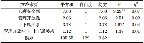 为了检验管理开放性、上下属关系及其交互作用对员工PSRB的影响 (假设1$\sim$假设3),本研究以PSRB作为因变量, 进行2$\times$2两因素方差分析. 在方差分析之前, 须先实施方差齐性检验. Levene's检验结果显示,$F_{ (3,130) }=2.14$, $ns$,说明方差具有同质性,适合进行方差分析. 分析结果如表 5所示.