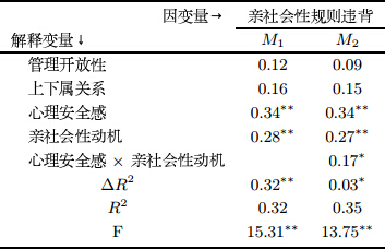 在实证研究方面,Morrison通过情境实验,以MBA学员为被试, 从个体特征、工作特征以及同事行为等方面考察了PSRB的影响因素[8]. 实验结果显示,如果个体的工作具有较高自主性, 或者其他同事以前做出过PSRB行为,则该个体更有可能会做出PSRB行为. 该研究还发现个体的冒险倾向与PSRB显著正相关. Dahling等最近则构建了一般性PSRB量表, 并确证了PSRB与反生产行为、组织公民行为、工作绩效等构念之间的区分性[9]. 该研究还再次证实了同事PSRB对员工PSRB的正向影响, 并发现"大五"人格中的责任心(conscientiousness) 对员工PSRB存在负向预测力.