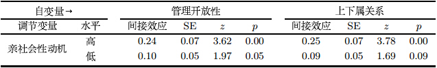 此外,亲社会性动机对心理安全感与PSRB之间关系的调节作用, 亦有可能会进而影响心理安全感对管理开放性和上下属关系与PSRB之间关系的中介效应, 即当亲社会性动机水平高低不同时, 心理安全感的中介效应有可能存在差异. 鉴于此, 我们根据Preacher等提出的检验方法和步骤[52], 运用他们开发的SPSS宏来检验这一推断, 用亲社会性动机加减一个标准差来代表该变量的高、低两种情况. 表 9列出了不同亲社会性动机条件下间接效应的估值、标准差、z值和显著性水平. 可以看出,当亲社会性动机较高时,管理开放性或上下属关系通过心理安全感作用于员工PSRB的间接效应 (0.24,$p$$<$0.01; 0.25,$p$$<$0.01) 强于亲社会性动机较低时的情形 (0.10,$p$$<$0.05; 0.09,$p$$<$0.10). 由此可知, 心理安全感对管理开放性或上下属关系与员工PSRB之间关系的中介作用会受到亲社会性动机的调节, 亲社会性动机越高,其中介作用越强.