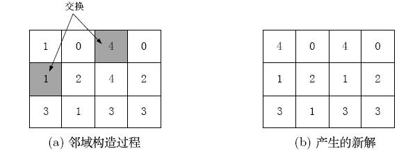 产生新解的方法即基于当前解构造邻域, 并从中选取一个新解来判断是否接受.本算法的邻域构造方法为随机选取不同两列中编号不同的数值进行交换. 新解产生后可能生成不可行解(不满足进场顺序), 需要在栈内按照进场顺序重新堆存. 图 5(a) 所示为解编码构造邻域, 若此时客户进场顺序为3-1-2-4, 交换后第一列与第三列均不能满足进场顺序,需要将"1" 置于"4"下面, 产生的新解为图 5(b).