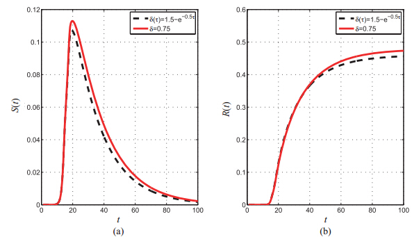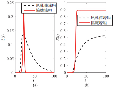 | 图 4 当$\langle k\rangle=18.74$,$\lambda=0.5$, $\eta=\gamma=0.5$ 时,遗忘率为常量和变量两种情况下的$S(t)$ 和$R(t)$ 变化图 |