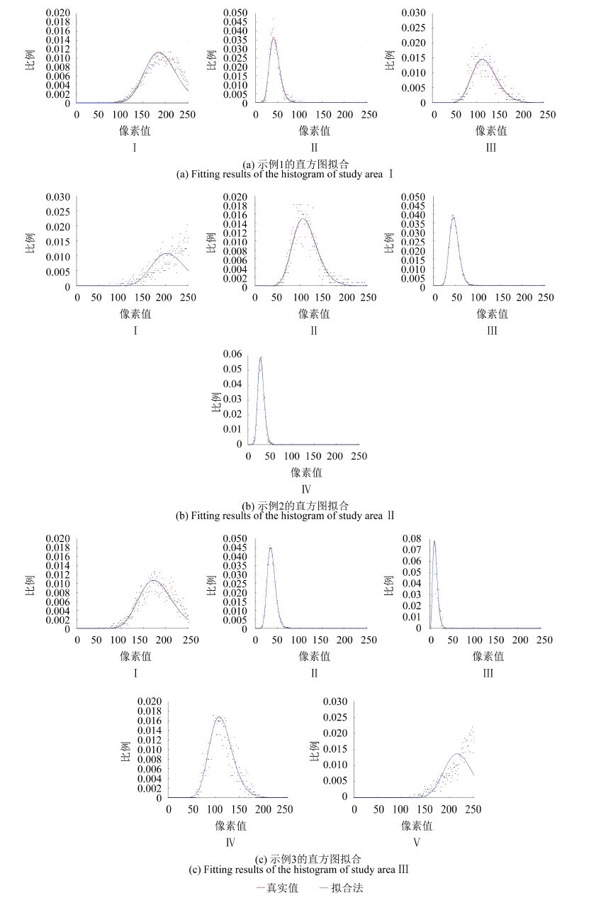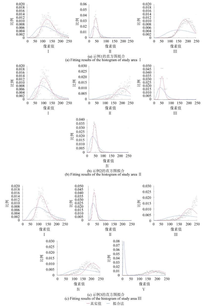 对比图 5(a)本文算法较EM算法而言更好地减少了噪声;对比图 5(b)本文算法更好地减少了噪声及误分现象;对比图 5(c)本文算法减少了错分和误分,类别数也更加清晰。从视觉角度分析,本文算法明显优于EM算法,主要是由于本文算法在分割过程中考虑了变化的形状参数对分割结果的影响,因此得到的分割结果优于EM算法。本文算法和EM算法对多视SAR影像分割的同时都会得到分割后的参数估计值,如表 4,可以看出本文算法估计出的参数值更接近多视SAR影像的真实分布参数值,而采用EM算法估计的参数值与真实值相差较大。对其各同质区域参数进行直方图拟合(图 6、图 7)。显然,本文算法可更好地与直方图拟合,而EM算法在拟合直方图时相差太大。EM算法直方图拟合产生较大误差主要是由于没有考虑各参数之间的相关性,形状参数α被限定为4,对唯一的变量β求导并进行最大化。此种方法的前提是各视之间相互独立,但是,在实际中,各视之间并不相互独立,并且SAR影像在成像过程中产生噪声具有随机性和复杂性,诸多因素都会影响SAR影像的成像,同样这些因素也会影响分割结果的精度。本文算法既考虑了各视之间地相关性,也着重强调各参数之间的相互影响,借用Newton-Raphson公式对α,β进行迭代最大化。对本文算法的分割结果进行定量分析证明了本文算法行之有效,且分割的结果和参数估计值都优于EM算法。