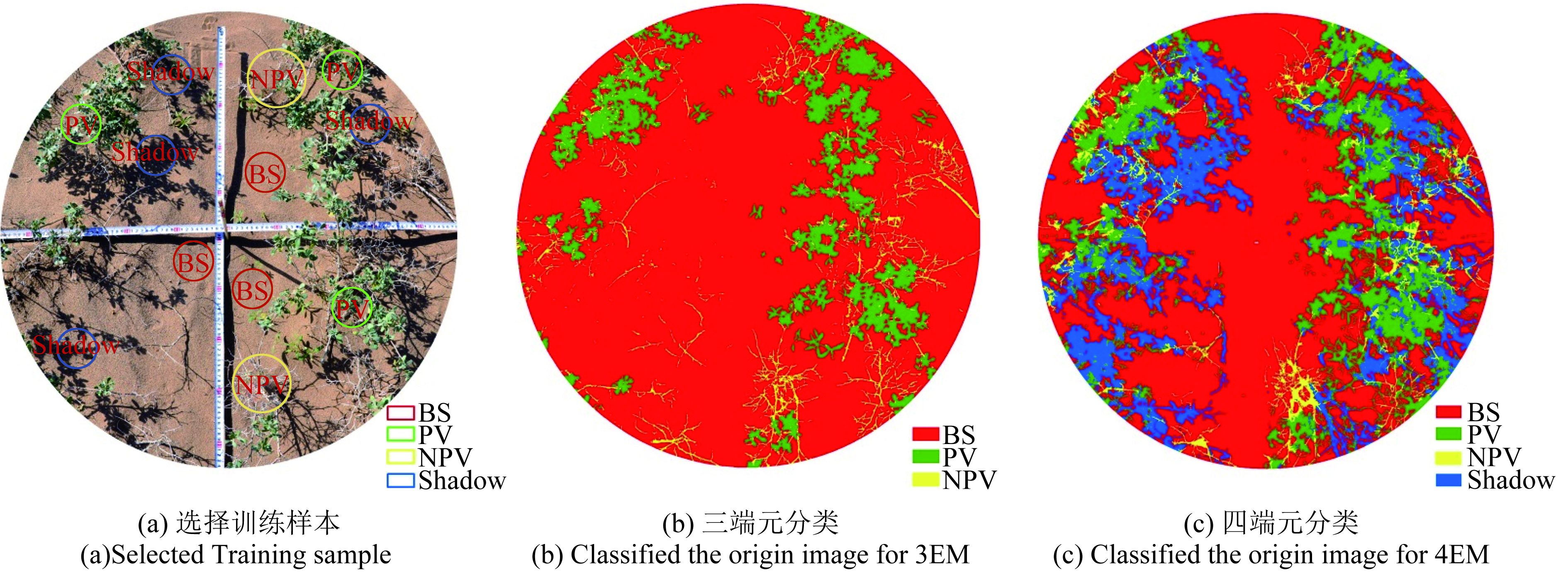 在研究区域内,采用数码相机拍照,每个样地重复拍照两次,获取每组混合光谱数据对应像片上地面覆盖度信息(图2)。图2(a)中两个交叉的卷尺用来标志ABS传感器在数字图像中视场角(FOV),对获取RGB照片,采集训练样本,采用ENVI 5.3中监督分类中的神经网络(NNC)分类算法对数字影像进行分类(Mishra和Crews,2014),分出PV-NPV-BS(3EM)端元(图2(b)),图2(c)中将阴影考虑在内,PV-NPV-BS-Shadow(4EM)不同端元给出不同的颜色(绿色为PV,蓝色为Shadows,红色为BS,黄色为NPV),对分类结果经过目视解译,判定分类结果精度,通过不同地类的像元数量统计出各地类的丰度,每一样地两次获取端元丰度取平均值作为该样地各端元最终丰度。