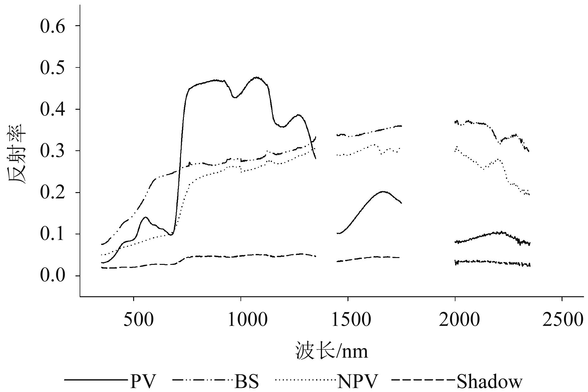 图3为一个典型样地的端元光谱曲线。通过整个光谱曲线可知,PV在红波段与近红外波段反射率差异明显,而NPV与BS反射率则不具有这一特征,因此PV相对NPV与BS相对容易区分。然而,NPV与BS光谱则非常相近,其区分则相对较为困难。从光谱特征来讲,500—900 nm、2100 nm附近两个窄范围区域,NPV与BS光谱有所差异,其中BS在500—900 nm光谱范围存在一个明显的弓形突起区(高志海 等,2011),NPV在2100 nm附近有一个受纤维素等非结构组分引起的吸收特征(李涛等,2015)。因此,从光谱特征来讲,高光谱数据具备有效区分PV、NPV与BS的能力。阴影反射率较低,且在全谱段范围内差异不大,与其他3类端元光谱特征存在明显差异。
