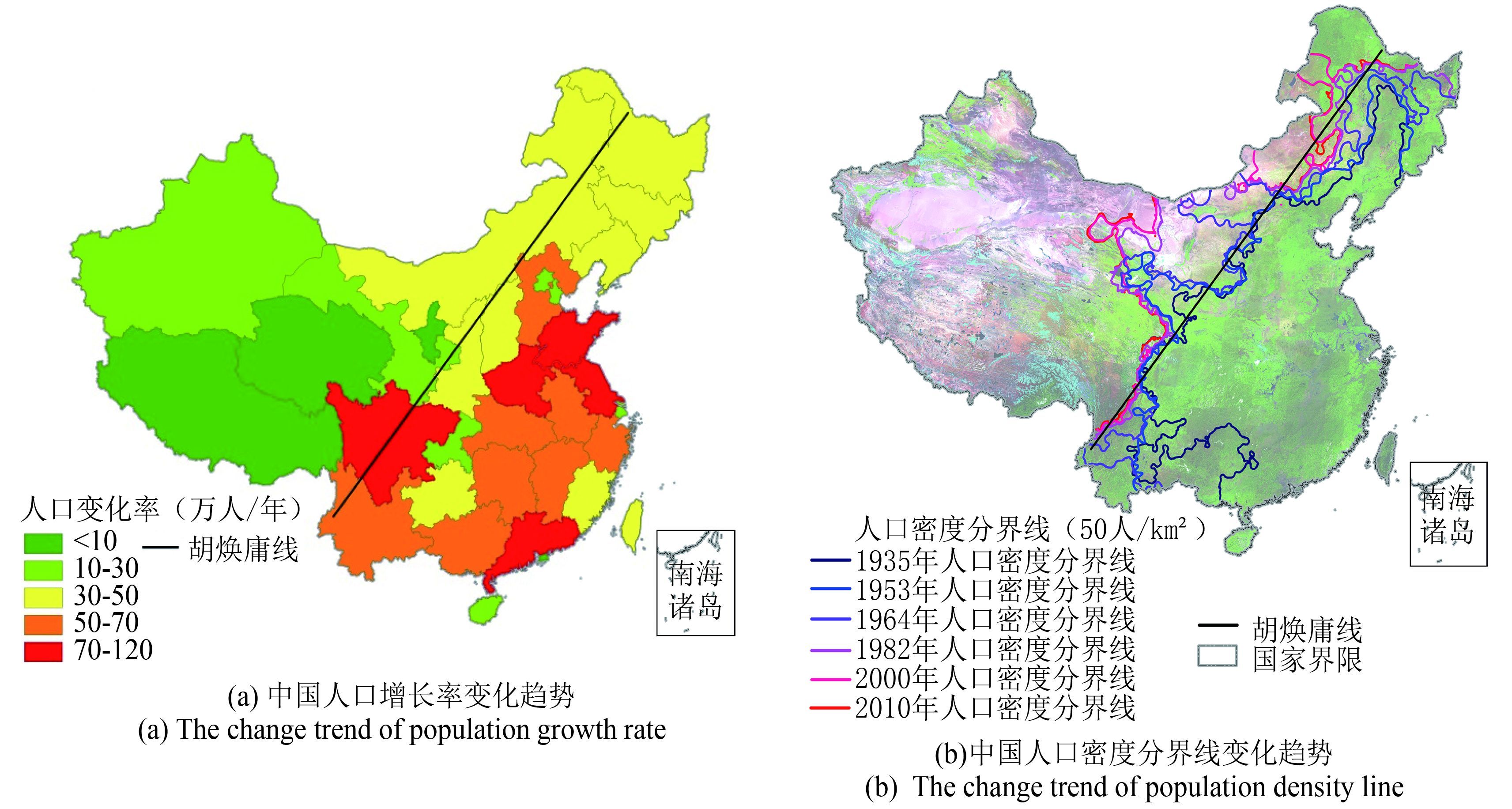 1952年—2010年中国人口分布依然呈现出“西部稀疏、东部密集”的态势,且在空间分布上,人口增长率比较明显的区域主要集中在中部和东南部(图 1(a))。受自然地理要素和社会经济活动的人口约束性要素的影响,中国人口主要分布在“三大阶梯”中自然地理条件相对温和、经济相对发达的第一阶梯,如华北平原、长江中下游平原、珠江三角洲和沿海地区,人口集聚呈现以平原地区为依托,“沿海、沿江、沿线”的高度集聚(刘睿文等,2010),且增长速度要明显高于西部地区,即自然地理条件复杂、社会经济发展相对落后的第二和第三阶梯。从34个省、市、自治区来看,河南、山东、江苏、广东和四川5个省区本身人口基数大,均位于胡焕庸线以东地区,且人口增长率要明显高于全国其他省份,加之长江中下游各省份人口增长率也相对明显,因而中国人口分布的非均衡性现象日益突出,且若这种态势长期、持续地发展,将严重超过联合国规定的承载极限标准,且不利于中国社会经济的可持续发展(王可,2011)。