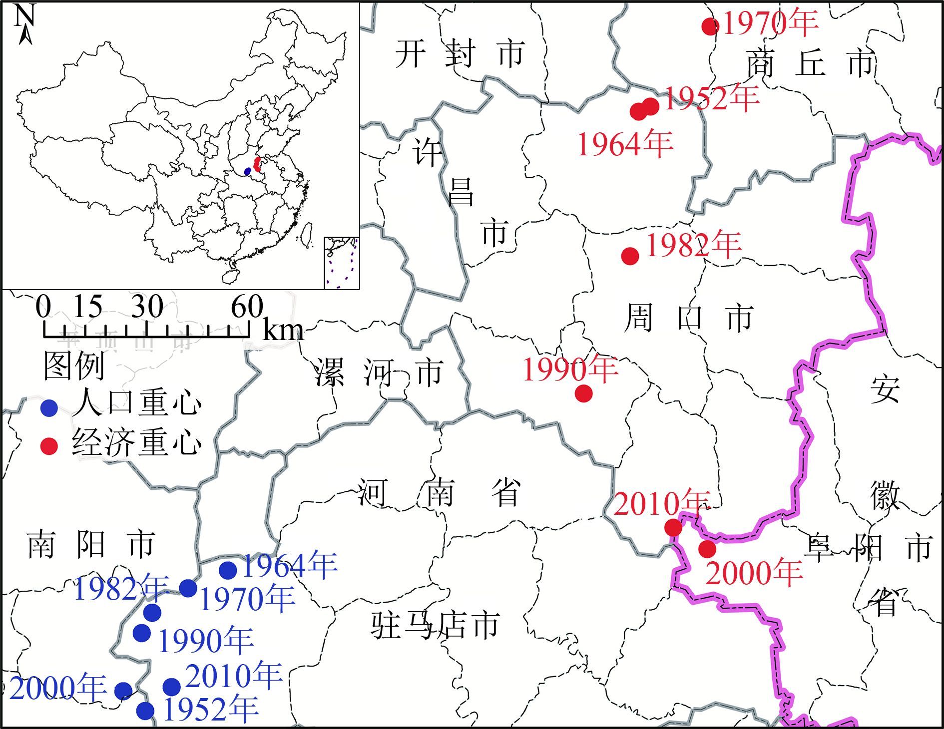 (2) 1952年—2010年中国人口重心始终位于河南省境内的信阳、确山和铜山一带移动,经济重心则在河南、安徽的交界地区左右摆动,二者均与中国几何重心相偏离,人口分布与经济发展呈现一定的非均衡性,东西部差异明显,且日益突出。