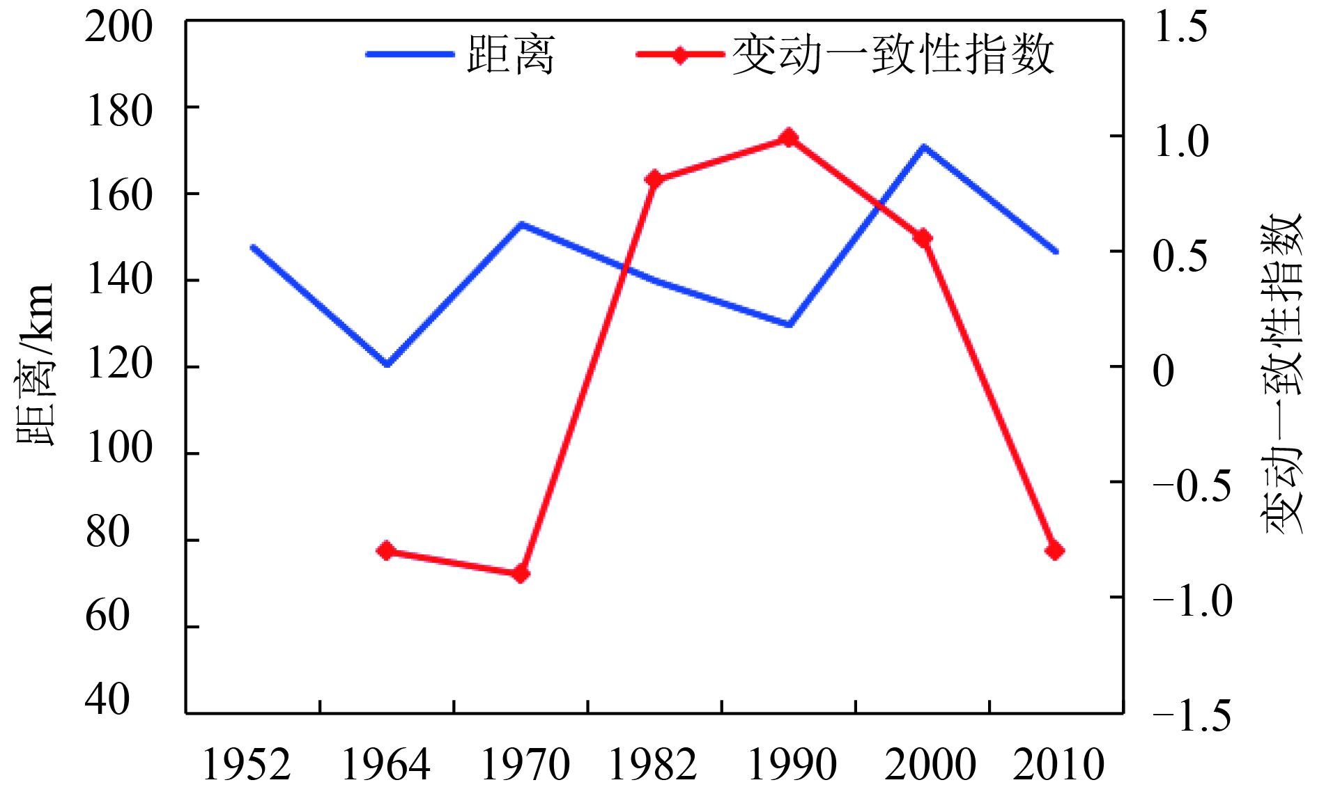 | 阶段 | 时间范围 /年 | 重心距离变化/km | 变动一致性指数 |