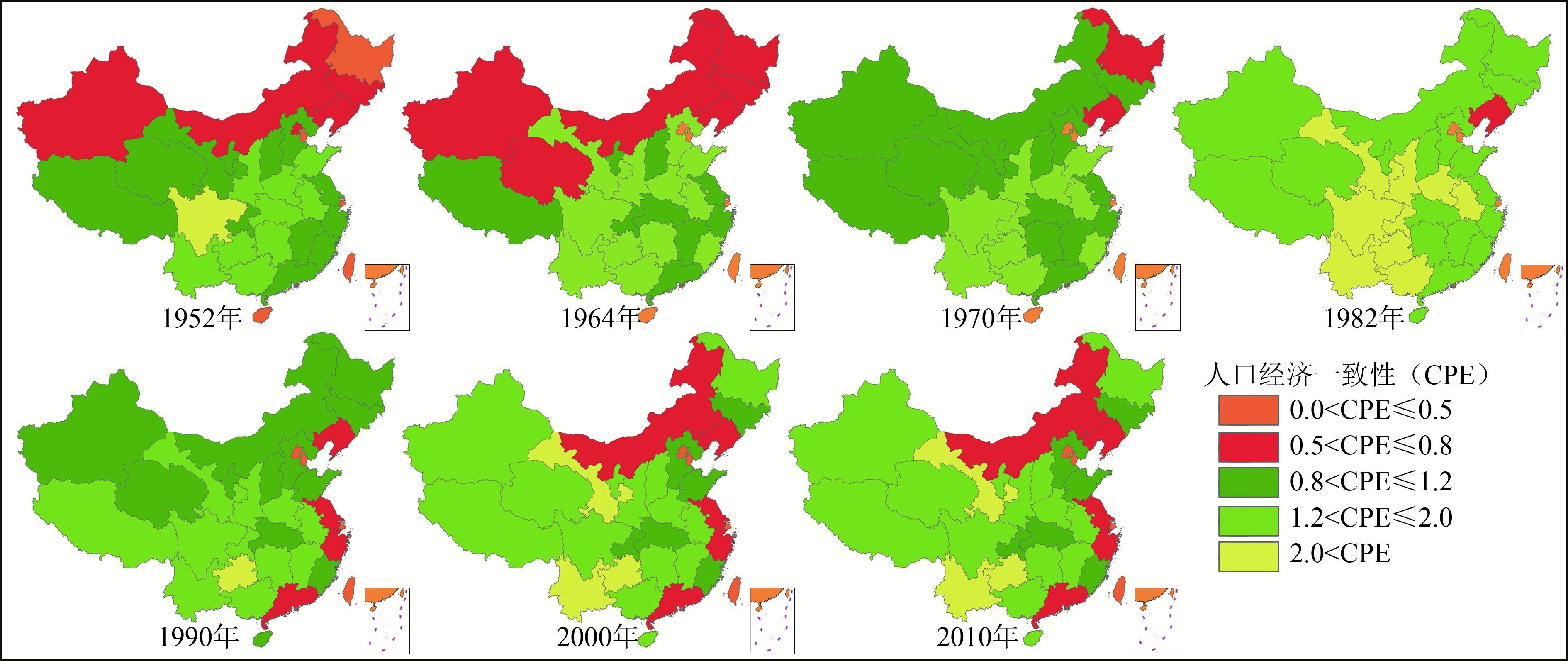 中国人口分布与经济发展的空间一致性的地域分异特征十分明显(图 5)。1964年以前,人口集聚低于经济集聚的地区主要分布在经济发展水平较高的京津地区和人口密度较小的新疆、内蒙古等西北地区,人口集聚高于经济集聚的地区主要分布在经济发展比较落后的甘肃、陕西、四川、云南、贵州等中西部地区,人口与经济发展基本一致的地区则主要分布在东部沿海各省。1964年以后,西部人集聚状况加强,人口集聚逐渐超过经济集聚,中西部各省的人口集聚程度略高于经济集聚程度,东部沿海地区由于经济的高速发展,经济集聚逐渐超过人口集聚。具体来看,1952年—2010年,西北地区的人口与经济集聚一致性程度在不断改善,人口集聚水平逐渐增强,在1970年达到人口与经济的基本一致,之后人口集聚逐渐超过经济集聚;1952年—1982年,东部沿海地区人口与经济基本一致,但随着改革开放的进行,经济集聚水平快速提高,经济集聚逐渐超越人口集聚。