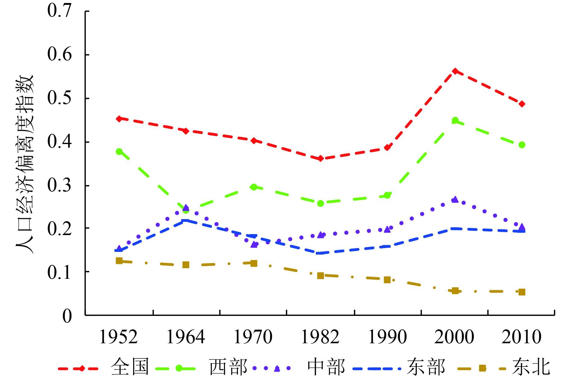 中国是一个人口和地域大国,经济体系呈现出多中心的空间分布特征(许家伟等,2011)。1980年以来,中国社会经济高速发展,但各区域的人口与经济发展水平呈现出极大的差别,人口分布与经济发展在空间上错位严重(刘睿文等,2010)。本文选用衡量人口分布与经济发展一致性程度的人口经济偏离指数为指标,来剖析全国及四大区域的人口分布与经济发展的空间一致性,揭示中国人口分布与经济发展的时空分异规律。整体上,1952年—2010年中国人口分布与经济发展的空间一致性呈现出逐渐减弱、快速增强和再次减弱3个阶段的变化过程(图 6)。1952年—1982年,全国人口经济偏离指数从0.45持续下降到0.36,下降了0.09,减幅达到每年6.67%,全国人口经济协调性逐步增强,在1982年达到最好;1982年—2000年,全国人口经济偏离指数从0.36增长到1990年的0.38,到2000年快速上升至0.56,增幅达到55.56%,全国人口与经济的协调性遭到极大的削弱,2000年达到最差;2000年后全国人口分布与经济发展的一致性程度得到了提高,偏离指数在2010年下降到0.49,减幅为12.50%。