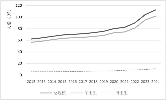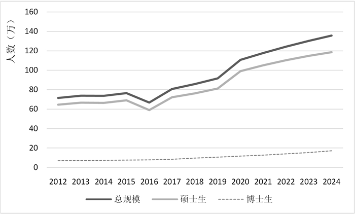 图 1 2012—2024年研究生的招生规模变化 注:根据教育部发展规划司提供的数据制图。 |