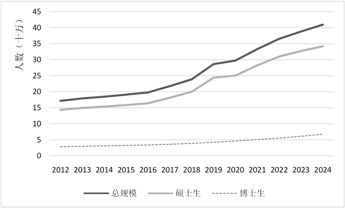 图 2 2012—2024年在校研究生的规模变化 注:根据教育部发展规划司提供的数据制图。 |