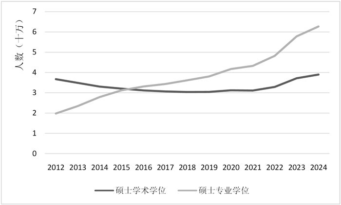 图 4 2012—2024年硕士学术学位与专业学位授予规模变化 注:根据国务院学位委员会办公室提供的数据制图。 |