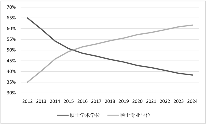 图 5 2012—2024年硕士学术学位与专业学位授予规模占比变化 注:根据国务院学位委员会办公室提供的数据制图。 |