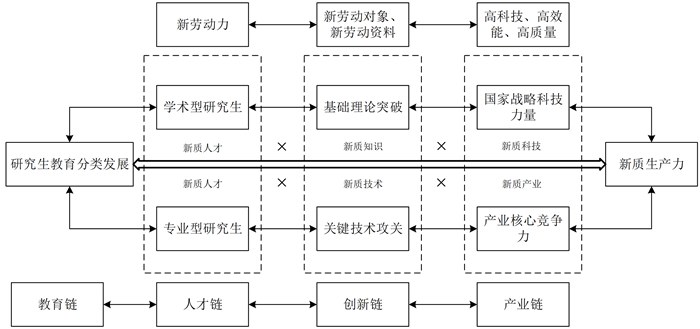 新劳动者即具备先进知识水平和专业能力的新质人才,是新质生产力发展的关键动力,内含创新性、引领性、动态性、循环性、市场资本性等特征[23]。它是掌握新知识、迈向新科学、具备新技术、迎合新需求的学术型与专业型创新人才,以目标导向引领研究生教育分类发展,进而为新质生产力发展提供相应的人力资源保障;新劳动资料的核心是劳动工具的数智化[24],也即新质知识与新质科技,它为研究生教育分类发展锚定主攻方向,推动高校研发高科技、高效能、高质量的生产工具,如算法、数字信息软硬件设施等;新劳动对象如新能源、新材料、大数据、区块链等,指引研究生教育分类发展的深化,也即在稳定学术型研究生培养规模基础上,聚焦国家重大战略、关键领域和社会重大需求,扩大专业型研究生培养比例并提升其质量。譬如新质生产力对绿色、数智化发展的需求,催生了对新能源、数字技术等的需求。而上述新劳动资料和新劳动对象均有赖于新劳动者的能动作用,即依托于研究生教育及其分类发展,进而构建具有中国特色、两种类型的研究生分类教育体系,着力推进前沿科技与关键领域学科发展。