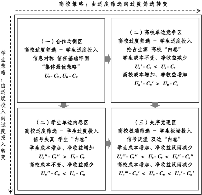 从博弈论视角切入,高校与学生不仅是博弈的主体,更是制度的共同塑造者。二者的策略选择,在微观上构成了互动行为;在宏观上,行为的汇聚与扩散,推动了夏令营制度本身的演化。而演化后的制度场域又会改变博弈的结构与收益预期,从而影响双方下一阶段的行为选择。为清晰刻画这一互动关系,本文构建高校与学生策略互动博弈矩阵。在该矩阵中,高校策略分为适度筛选与过度筛选,学生策略则为适度投入与过度投入,两者交叉形成四种基本情境。矩阵中的每一格分别表示特定策略组合下,高校与学生的预期净效用,即预期收益减去投入成本。在变量表示上,统一用U表示收益,C表示成本,并通过下标加以区分:下标s表示学生,u表示高校。高校与学生的策略互动博弈收益矩阵如表 1所示。