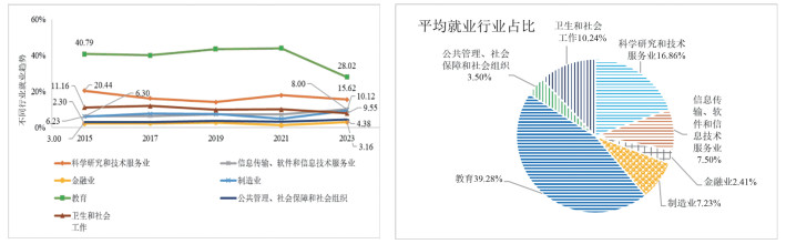 2015年以来,工科博士职业选择类型呈现出“主导行业稳固、新兴领域拓展”的双重特征(图 1)。从行业分布结构来看,博士毕业生的职业流向分布形成四个清晰的层级。第一,从事“教育”行业相关工作仍是博士毕业生最主要的职业路径,平均占比达到39.28%,显著高于其他行业,但相对比重呈缓慢下降趋势,这与美国博士职业选择的演变趋向基本一致[14]。这反映出高校与科研机构在工科院校博士就业中仍占核心地位,尽管就业市场竞争加剧,但高校和科研机构仍然是博士就业的首要选择。第二,投身“科学研究和技术服务业”成为博士的第二大职业选择,平均占比为16.86%。第三,“信息传输、软件和信息技术服务业”与“制造业”共同构成博士就业的第三大方向,平均占比分别为7.50%与7.23%。值得注意的是,信息技术服务业占比呈现稳步上升趋势,从2017年的6.30%增至2023年的10.12%,说明人工智能、集成电路等数字经济重点领域对工科博士的吸纳能力不断增强。第四,进入“公共管理、社会保障和社会组织”(3.5%)、“金融”(2.41%)等领域的博士虽占比较小,但体现出职业选择的多元化倾向,再次与现有研究结论不谋而合。[15]