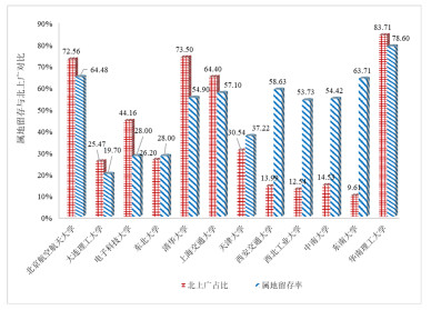 图 3 不同高校博士毕业生属地留存率与“北上广”流向情况对比 |