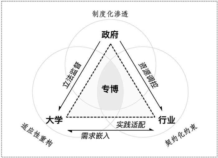 伯顿·克拉克(Burton Clark)提出的“三角协调模型”认为,高等教育系统受国家权力、市场力量和学术权威三者的共同作用,三者构成三角形的三个顶点,通过相互制衡形成稳定结构。三螺旋理论由埃兹科瓦茨(Henry Etzkowitz)提出,主张政府、产业和大学形成动态协作网络,通过知识流动和资源共享推动创新。三者动态互动形成螺旋式上升的创新生态系统。对比来看,三角协调模型更注重三者之间的权力平衡和静态结构,偏向于系统内的协调机制,而三螺旋强调动态协作和创新网络,更关注创新过程中的互动和知识转化。将二者作为理论框架应用到本研究中,三角协调模型提供结构性分析框架,解释“谁参与”(角色),明确政府、企业和高校在专业博士产教融合中的角色分工;三螺旋理论补充过程性视角,解释“如何协作”(路径),揭示三方如何推进产教协同。