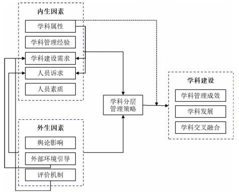(二) 模型阐释基于上述模型和扎根理论分析,高校学科分层管理策略受内生因素和外生因素共同影响,下文将具体分析模型中几组重要的影响关系。