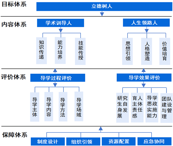 (一) 聚焦“立德树人”构建目标体系设定目标是将无形变为有形的第一步。在我国研究生教育内涵式发展理念的引领下,各高校对于立德树人这一研究生教育的根本任务已经达成共识。导学思政具有知识传授、能力培养和价值塑造的功能,与立德树人作为我国教育根本任务的目标指向具有内在一致性。因此,高校重大科技项目团队研究生导学思政体系的构建,要紧紧围绕立德树人这一核心目标体系,进而确定其内容体系、评价体系及保障体系。