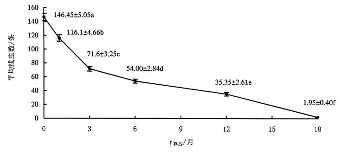 从图 2可知,收获后不同存放时间内花生果荚中短尾短体线虫数呈现极显著差异(P < 0.05)。收获时花生果荚线虫数最多,平均每10克花生果荚含146条线虫,随着存放时间的延长,果荚中线虫数不断下降,存放18个月后仅能检测到极少量的线虫。由此可知,收获后花生存放时间长短对果荚内短尾短体线虫的种群数量存在影响,存放时间越长,果荚中分离的线虫数则越少。