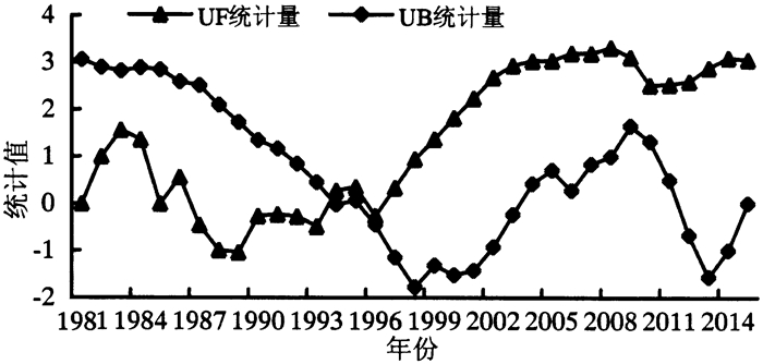 图 2 1981—2015年闽东地区≥10 ℃年积温Mann-Kendall统计曲线 Figure 2 Mann-Kendall statistical curve of ≥10 ℃ accumulated temperature in Eastern Fujian Province during 1981 to 2015 |